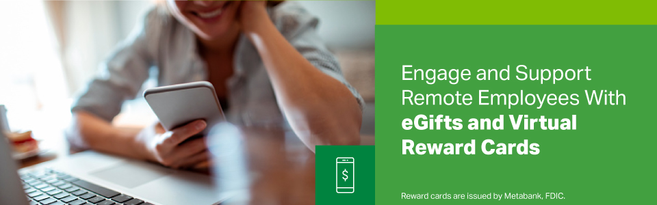 Virtual Visa® or Mastercard® Reward Cards in digital formats. Give employees the choice where to spend the funds. Allow them to buy lunch, stock up on notepads and more. Buy and distribute within minutes.